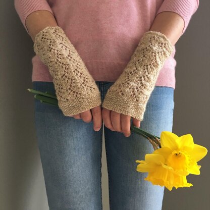 These pretty wrist warmers are knitted flat in an easy to remember lace pattern and then joined to work in the round for the moss stitch top edge. This makes them a super quick project and the finished mitts are comfortable to wear. With the warm weather starting to appear, I realised that 3/4 length sleeves which are great around the house are a little chilly when out and about so I made myself these cuffs which look so pretty underneath jacket sleeves but are snuggly and chic at the same time. They can be bunched-up or pulled down according to how you feel. The great construction technique means it's almost like making a useful tension square and all this for less than 50gm of yarn!