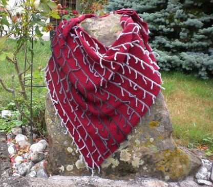 This triangular shawl is worked mostly in basic Tunisian crochet. The special feature is colorful stripes with little “snakes” that happily bounce around. Working from one tip to the opposite edge, the stripes will be on the bias.