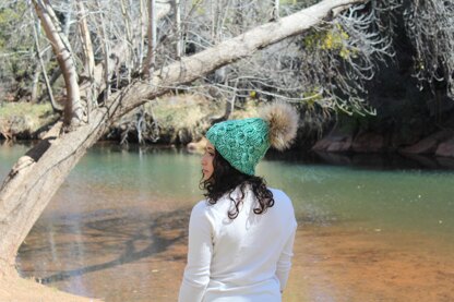 Mega Clyde has a simple cable pattern all the way around. You have the option of a beanie or a slouchy hat. Knit entirely in the round, brim up and seamless, this is a fast and only takes a few hours to make. The fur pompom can be found in the Etsy shop: Wabarna