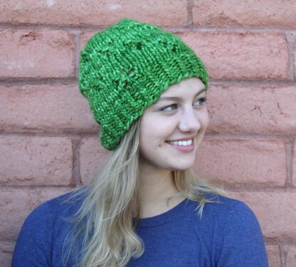 Mega Winter White has a simple eyelet pattern all over. The pattern is written out and charted. Knit entirely in the round, brim up and seamless, this is a fast and satisfying knit.