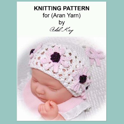 Mel Daisy Flower Lace Effect Multi-size Baby or Reborn Doll Hat Aran Yarn Knitting Pattern by Adel Kay