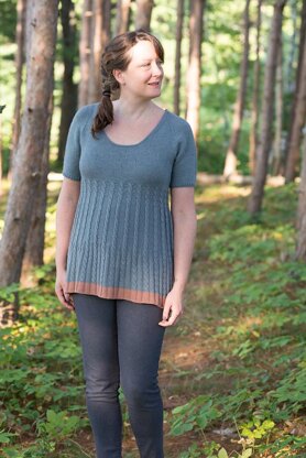 Melianthus is worked in from the top down with a shaped scoop neck. The top is worked in Stockinette Stitch with a very simple cable pattern beginning below the bust to form an A-line shape. A second color is used to work the final rib trim section.