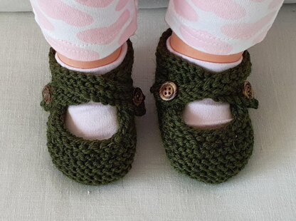 These garter stitch baby shoes have a high back, and two ankle straps that are crossed and buttoned.