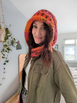The hood is one size, to fit an adult head circumference of approx 57cm/22’’. However, it would be easy to modify the size for a smaller head, by working less rows. It is worked in one piece with no seaming involved. It uses granny stitch with a tension/gauge of 3.5 groups to 10cm/4’’ with a 5.5mm crochet hook. The orange version was made using Hobbii Mocktail, which is a lovely soft variegated yarn. It is listed as Aran, but is fairly thick and feels more like chunky weight. The pink version was made using Join the Dots by Knitcraft - which is a chunky heavier yarn.