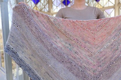 Easy to knit, this shawl is perfect for picking up here and there when new scraps appear. Or sit down for some relaxing TV knitting with your bag or jar of those precious left-overs.