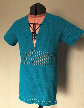 This men's crochet t-shirt pattern features a daring deep V neck line that ends below the chest. The neck is designed to be held closed with a cord. There are also mesh panels on the front and back, which provide ventilation and reveal tattoos. The pattern is for a longer t-shirt that covers the glutes. There is a lot of stretch in the finished item, so the sizing is only approximate. I have listed this pattern as "advanced" because of shaping and being able to read a pattern with multiple sizes. You are purchasing the .pdf pattern only, which includes full written instructions. The instructions include lots of detail to ensure complex shaping is made easy. The pattern includes details for making the four different sizes, small, medium, large and extra large.