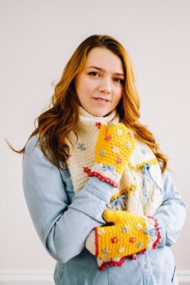 Introducing the Merino Meadows Mittens & Scarf Set: a delightful knitting project that embraces the softness of merino yarn and the vibrance of spring colors. This easy-to-knit accessory set features a canvas of simple textured stitches complemented by playful elements of color, leafy lacework and delicate floral embroidery. Adorned with folded picot edges and charming braided bows, this set exudes a touch of elegance and whimsy, making it an instant springtime favorite.