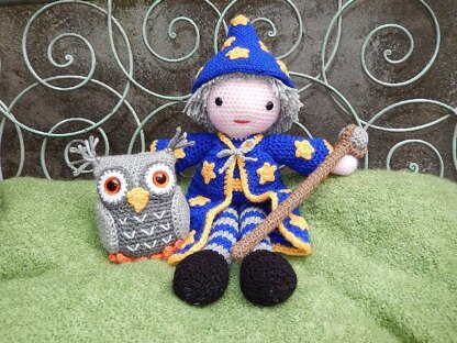 Merlin measures approx. 13" (36 cm) tall and Hoots is approx. 4" tall when made with light worsted weight (DK/8 ply) yarn and a size D (3.25mm) Hook.