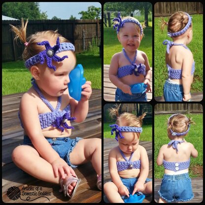 Headband and bikini top for mermaid tail. Mermaid tail pattern NOT included! NB-2t sizes included. Some children will be able to fit into 2t size. Children with 17-21 inch chests and heads 14-18 inches will fit into this pattern.