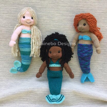 These Mermaid Dolls are knit in the round, using Magic Loop (or double pointed needles). The tail/fin, upper body, arms and head are all knit on as you work along. There are 3 choices of tail styles: straight, curved or sitting. There are 3 choices of fins and removable tops. They may be interchanged with the tail positions. The sitting mermaid style is approx. 11” (sitting), the curved and straight mermaid styles are approx. 16”. The dolls are worked in worsted wt. (Aran/10-ply) yarn, and I used #6-Super Bulky wt. yarn for their hair. They take approx. 240 total yds.: 90 yds. (for doll upper body), 30 yds. (for Color A of tail, fin and top), 70 yds. (for Color B of tail, fin and top), and 50 yds. (for hair). A smaller doll could be achieved by using #3-Light Wt. (DK wt.) yarn with smaller needles. These Mermaid Dolls, with their sweet faces and many choices, are sure to bring fun time to someone special!