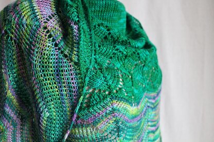 Mermaid Kisses is a top-down crescent-shaped shawl that utilizes two lovely skeins of yarn, paired perfectly for the scale liked lace and finished off with the tail lace.
