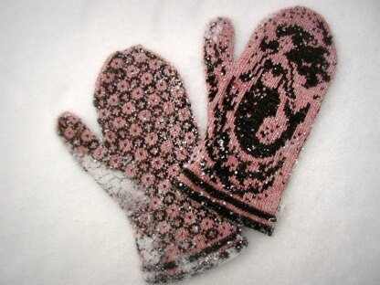 Mittens are knitted from cuff up in round with set-in thumbs. Pattern includes written instruction and full charts of both right and left mitten of each version.