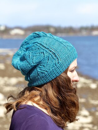 This slouchy beanie has columns of different stitch patterns: simple lace and some seed stitch making it very light and airy. One of the lace columns adds an ever so slight twist to the hat, making it a bit whimsical.