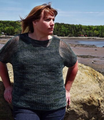 The perfect layering piece! This is a loose fitting garment and has approx 10-15 cm / 4-6 ins of ease. It is worked from the top down in rows and sewn at sides and underarm. Simple crochet finishes the neck and sleeve borders.