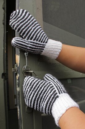 A perfect contrast of vertical and horizontal stripes the mesmerizing mittens are a graphic treat for the hands and the eyes. Stitches are made for the gusset by moving the thumb stitches across the palm in a combination of garter stitch and slipped stitches.