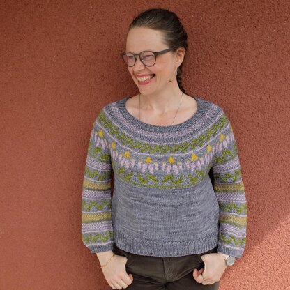 The design is worked top down with neck ribbing, short-rows, then stranded colorwork, sleeve separation and then body finish (length is easily adjusted). Sleeves are worked in stranded colorwork and their length can easily be adjusted as well.
