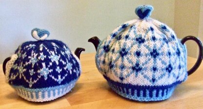 About The Design: This tea cozy will bring the delight of a winter night’s snowfall into your home to enjoy, even if you too don’t get to see snow. The drama that light stitches create, against a dark background, are well worth it, and tea cozies are small projects, which knit up quickly. This drama is enhanced by a third color duplicate stitched on afterwards, which makes the snowflakes twinkle! There is also a light color background option.