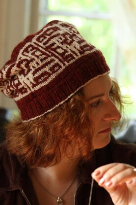 My fascination with Kufic script combined with the idea of leaving a message on a spindle inspired this hat. The design on this slouchy hat is a Kufic square, a traditional Arab design that takes a word or phrase in Arabic and makes it into an attractive design.