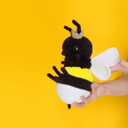 The instructions are written in English in US crochet terms. There are step by step photos detailing how to make the pieces and finish the toy. When made with DK weight chenille yarn and DK weight cotton yarn (sample made in Sirdar Happy Chenille and Happy Cotton) and 3.50mm hook the finished bee will measure about 30cm/12in tall from the antennae to the tip of the stinger.