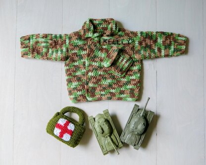 Adorable camouflage baby sweater designed to look like a camouflage combat uniform includes angled front pocket and pen pocket on the sleeve. Mix and match rattles to create a personalized baby gift. Pattern includes alphabet chart to add personalized name plate.