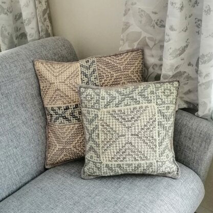 The Mill Star cushion cover features an original graphic mosaic pattern, created specially for this design. The cover is knitted in blocks, in mosaic garter stitch. Reversing the main colour and the contrasting colour adds visual effect. The pattern is for the front of the cushion cover only. You need a premade cover to sew it on.