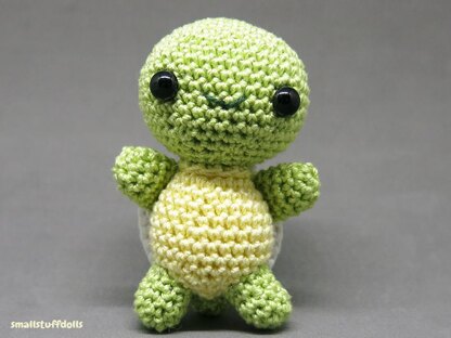 An adorable, tiny crochet turtle made with size 10 crochet thread, 2mm crochet hook, 6mm safety eyes and stuffed with polyfil. Uses single crochet, increase, decrease, color changing, Front Loop Only and Back Loop Only. Pattern can be sized up using a matched yarn/hook that makes a similar gauge/stitch tightness as the given materials.