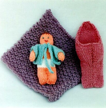 A nice soft, small toy for babies and toddlers! Easy to knit, baby friendly! Baby is knitted in one piece, with a cozy saque, blanket, and a sleeping bag bunting. These work up fast. Add one of these sets to a gift for your next baby shower! Nice size for small hands. Doll is about 6 inches tall. Uses sport weight yarns, and knitting needles, US # 6, and US # 10 for blanket.