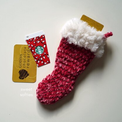 A large (standard Christmas stocking) size is available too! Check out the Sweet Softies website for the free "Velvet & Fur Stocking" crochet pattern.