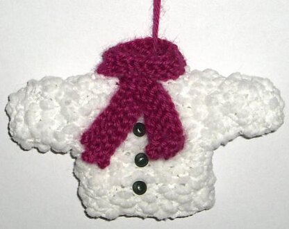 A mini Christmas sweater is decorated in four ways - snowman, Santa, fairy and tree. The sweater is worked in two pieces, with cuffs and collars picked up and knitted on. Santa has a garter stitch beard, snowman has a garter stitch scarf, fairy has garter stitch wings, and tree is decorated with a star and beads.