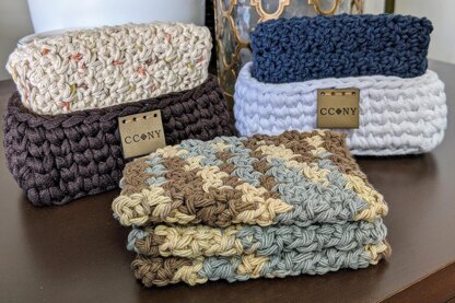The Mini Cloth and Basket pattern includes instructions for a set of 3 cloths and the basket to hold them. It is the perfect size for your kitchen or bathroom. This crochet pattern creates a set of three mini washcloths (approximately 4.5” x 6.5”) and the basket to place them in (approximately 5.5’ x 3’ x 2’). They are great for quickly wiping up spills, washing your face or your child’s messy hands. You can use them to wash dishes as well.