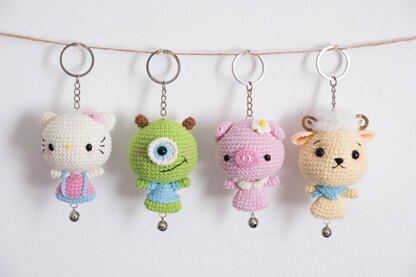 Materials Needed: 4-ply milk cotton, (milk white #02, light pink #05, light yellow #10, mustard green #25) one ball each; (sky blue #18, pink #06, light coffee #31) 10 grams each; (black #34, bright yellow #12) 5 meters each Candy yarn, white (5 meters) 5 x 7 mm oval straight in eyes (4 pairs) 8 mm flat bottom eyes (3 pairs) Four silver key rings Four silver bells Ten split rings A thin wire Toy stuffing (50 grams) Scissors Yarn needle Stitch marker Alcohol glue 1.8 mm crochet hook Beading needles Adhesive strips (20 cm)