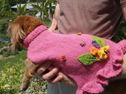 The dress is knit flat on DK/light weight yarn and I’ve included instructions for the leaves and flowers. As I always assure my buyers, I want you to have fun and end up with a fabulous garden frock for your doggie. So if you have any questions please Email me at the address listed on the pattern.