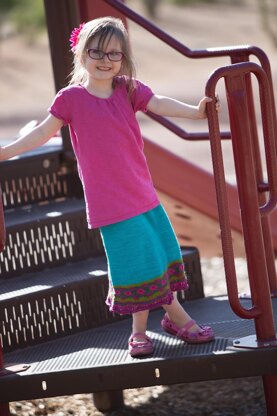 Mini-skeins are popular these days and have been use d in everything from shawls to mitts. This is the “mini” version of Flower Duet, perfect for your favorite accompanist! This skirt is knit in the round, from the waistband to the lace edge. The color work chart uses 1 pack of Lorna’s Laces String Quartets.