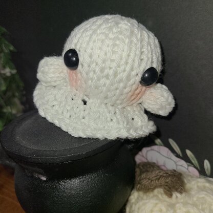 A strong textmini Ghost softee, perfect for bag charms, garland, or any other Halloween decor you can think of. This pattern isn't gauge specific so you can play around with different yarn types- I've done regular worsted, fuzzy and glow in the dark (which comes out really cool imo). It's all knit in round with minimal seaming. Pattern includes written instructions and photos