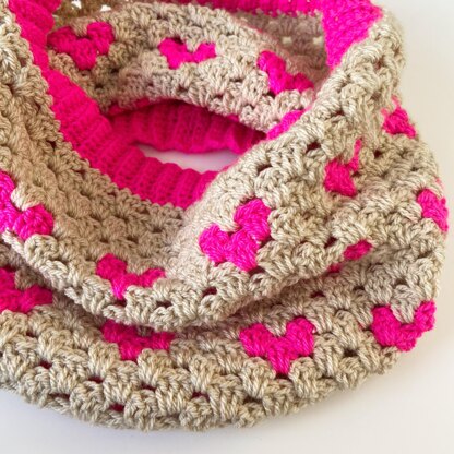 Stay cosy in this fun, heart themed cowl. Using simple basic stitches and just two colours this is a quick and accessible project for beginners and beyond. Whip yourself up a cowl and then maybe another for the one you love? Happy crocheting!