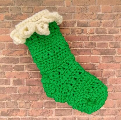 The stocking is made using single crochet stitches, crossed double crochet stitches, linked Tunisian Purl stitches and half double crochet clusters. An optional loopy edging can be added for a fun and whimsical touch.