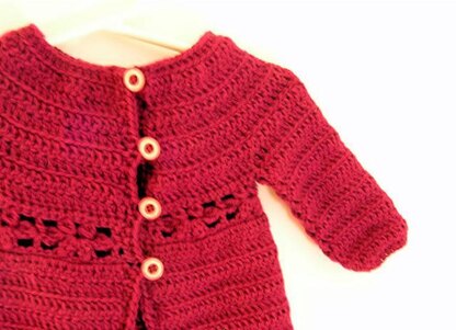 Worked in the round from the top down, a super pretty cardigan for little girls, with a pretty floral motif and rounded bottom edging.