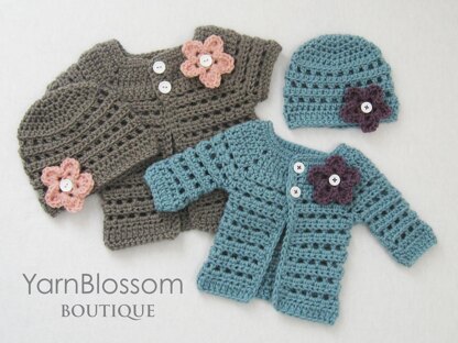 This pattern is for an adorable cardigan and beanie outfit. The pattern includes instructions to make the cardigan in 4 sizes and with the option of long or short sleeves. This little cardigan and beanie set is perfect to keep your baby warm or for her to wear in her first photos!