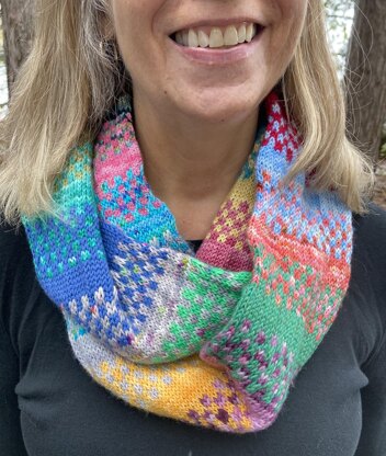The Mini Patch Cowl was inspired by two things: ten gram mini skeins of fingering weight yarn and the patchwork quilts that are near and dear to my heart. I was winding up mini skeins of leftover fingering weight yarn when I knew I needed to do a pattern to use these cute little bits. As I was knitting and designing, I kept thinking about how putting together the colors was like the way I approach making a scrap quilt, and the mini squares in the design reminded me of little quilt patches.