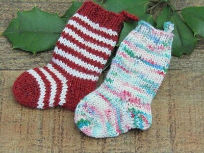 Worked toe-up, this mini stocking takes a very short time to knit, especially with the easy short-row heel.