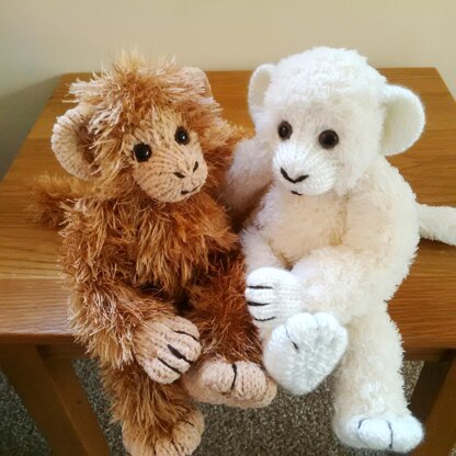 In my quest to supply entertainment for my grandson I designed a mini monkey. He loves him as he's totally flexible and easy to carry around. Mini the Monkey is a petite monkey, measuring 30cm/12 inches from head to toe. His tummy measures 25cm/10 inches. His body and legs are knitted as one piece with knee and elbow joints to make him completely flexible. He can be knitted with any worsted weight/Aran yarns. I have tried eyelash, boa, fleecy yarns such as Snowflake and Pipsqueak, or soft chenille. He is knitted flat and assembled. This pattern includes a detailed step-by-step guide; full of photos and tips to help you assemble your monkey. Print warning: It may be best to print just the knitting directions and save the step-by-step guide to refer to as and when necessary on screen or it will drink your printer ink and eat your paper!!
