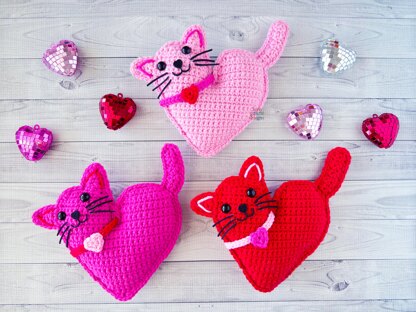 Our finished Mini Valentine Heart Cat Kawaii Cuddler® is 7" x 8". Hook size, yarn choice, and crochet tension will affect each individual result.