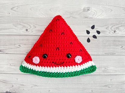 Our finished Mini Watermelon Kawaii Cuddler® is 7" x 6". Hook size, yarn choice, and crochet tension will affect each individual result.