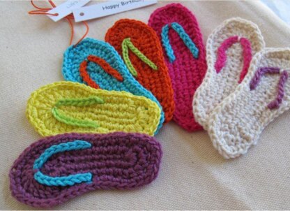 The flip flops range in size from about 2 1/2 to 3 1/2 inches in length depending on the yarn used. I typically use light weight cottons for the sole and embroidery floss for the strap. Perfect for using up ends of fine yarns - the sole requires about 4 to 5 yards of yarn.