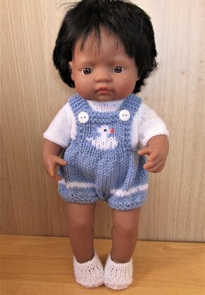 Easy to make outfit for a 36cm baby doll comprising romper suit with duck motif and crossover straps, T shirt with back opening and matching shoes. You could knit this without the duck motif if you are a beginner.