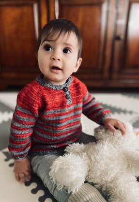 Stripes are fun and this little top down raglan sweater pattern has options to knit it with two, three, or even four colours! Minimus is knitted in sport weight and comes in seven sizes, from newborn to 24 months and is worked in the round. The neckline comes with a button band for easy dressing. Stitches for the neckline and the buttonband are being picked up at the end.