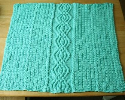 This is a simple cable blanket although it looks very intricate. Even though the center cable looks large, it still drapes beautifully and is easy to wrap a baby in. This is a fun pattern to knit because the center cable is always changing.