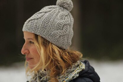 This hat begins at the brim with ribbing and is knit bottom up with a cable pattern and crown shaping. Both written and charted instructions are provided.