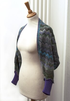 Knitted in stripes from 2 separate balls of the same shade of Noro Kureyon Sock yarn the chevron stitch pattern becomes exaggerated creating a more obvious zig zag effect. The garment is knitted from cuff to cuff in a combination of rounds and rows with increasing at the centre of the underarm. The solid coloured 4ply Rialto makes a feature of the pointed edge and the rib cuff adds another unusual twist.