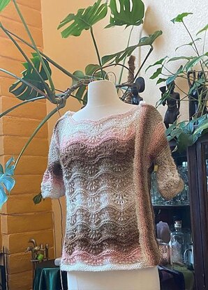 I designed and knit this pattern . This top is knit using garter, stockinette, fan and feather stitches. It is an easy to follow pattern for intermediate knitters, written for the minimum of complications, with a lot of pictures and very detailed explanations.